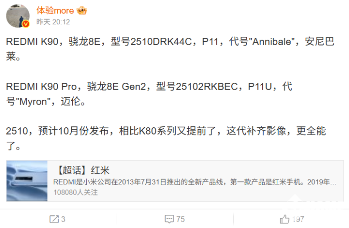 7月7日消息,昨日,数码博主@体验more曝光了REDMI K90系列的部分相关信息。