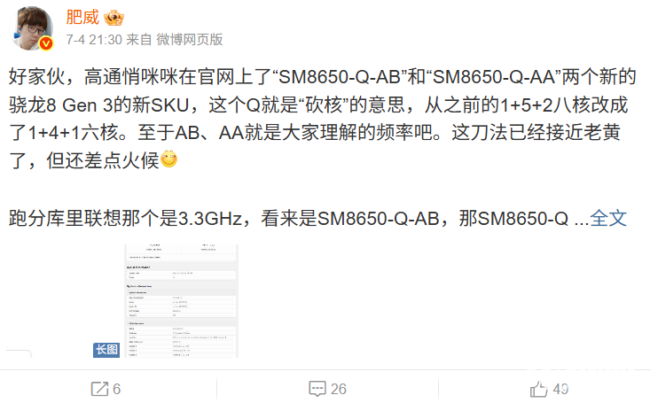 据了解,这两个型号核心配置大幅缩水,架构从标准版的八核心(1个超大核+5个大核+2个小核)变为六核心(1个超大核+4个大核+1个小核)。在频率配置上,Q-AB版本保留3.3GHz超大核,而Q-AA版本则降至3.0GHz。