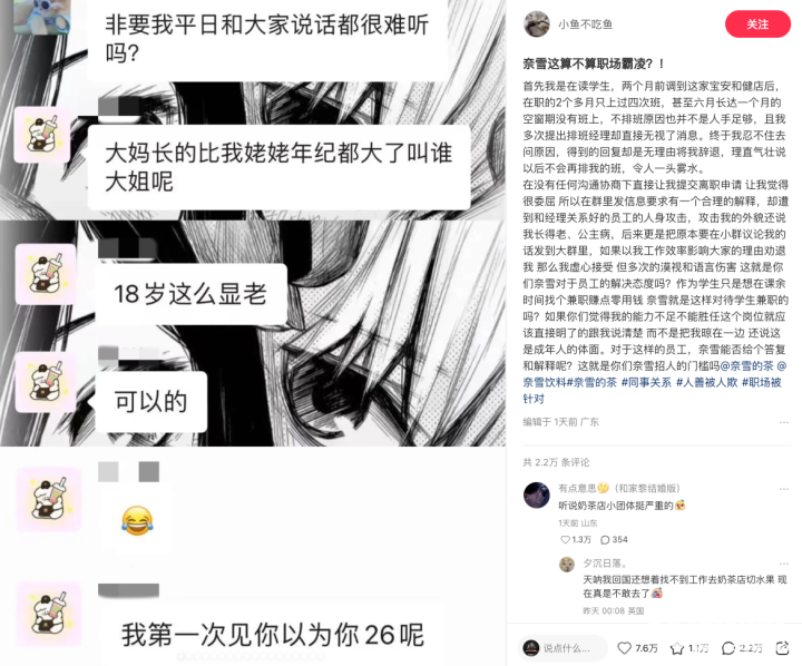 近日,一位ID为“小鱼不吃鱼”的在读大学生在小红书平台发文控诉,称自己在奈雪的茶宝安和健门店兼职期间,遭遇无故停排班、无理由辞退以及职场语言霸凌,引发广泛关注。