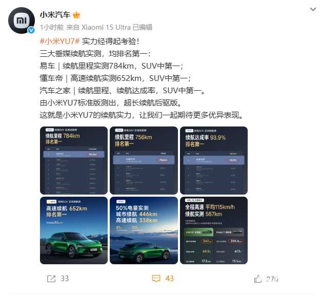 7月7日,今日小米汽车官方发文称,小米YU7在三大垂媒:懂车帝、易车、汽车之家的续航实测,均排名第一。