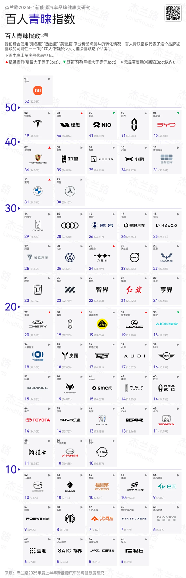 7月7日,杰兰路今日发布了2025年度上半年新能源汽车品牌健康度研究。据了解,百人青睐指数是基于品牌知名度、熟悉度与美誉度从而综合计算得出。该指数作为一个反映品牌公众吸引力的综合性指标,用于衡量在每一百人中有多少人对品牌抱有好感。指数数值越高,意味着品牌在汽车消费群体中的认可度与喜爱度越高,即具备更强的公众青睐力。该调研覆盖了65个新能源汽车品牌,询问超过8,200名新能源车主用户的意见。