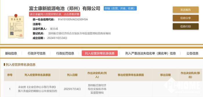 国家企业信用信息公示系统网站显示,7月4日,富士康新能源电池(郑州)有限公司因未按时提交并公示年度报告,被当地市场监管部门列入“经营异常”,此企业信用监管措施通常针对违反相关法规的企业,该通报属于常规监管通报,可能是程序疏忽或流程延误导致未及时提交年报。也有可能是公司内部管理问题或业务停滞。