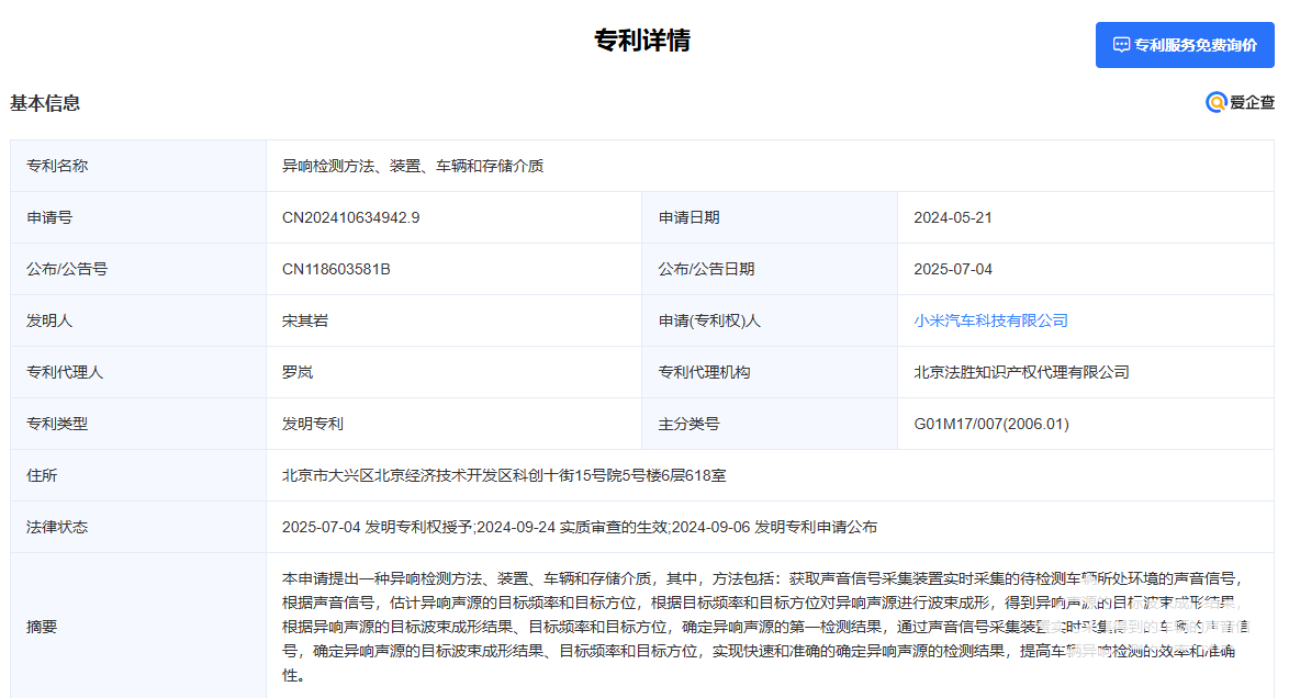 7月7日消息,近日,小米汽车科技有限公司申请的“异响检测方法、装置、车辆和存储介质”专利公布了。