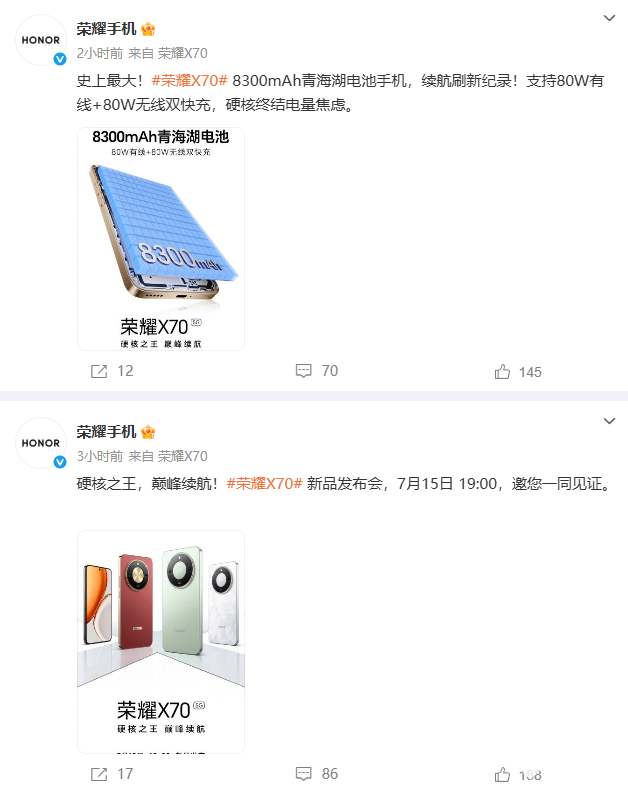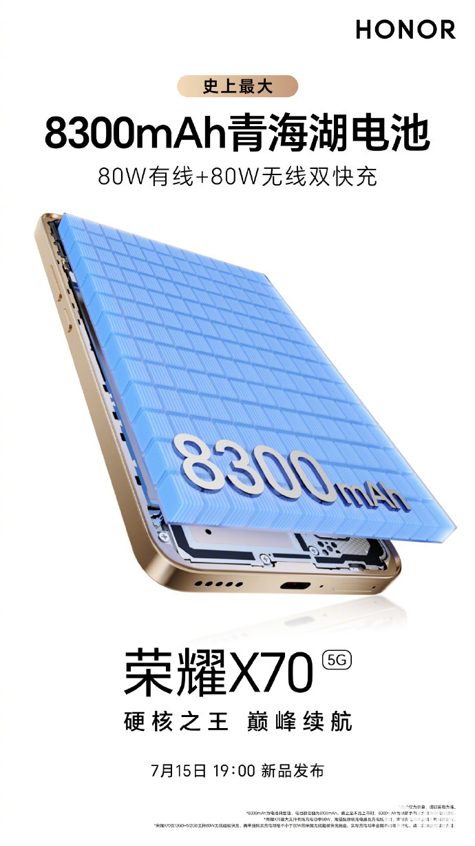 7月8日,荣耀手机今日官方发文预热荣耀X70,称荣耀X70会配备史上最大的8300mAh青海湖电池,续航刷新记录。并且支持80W有线+80W无线双快充。官方表示将会在7月15日19:00正式发布。