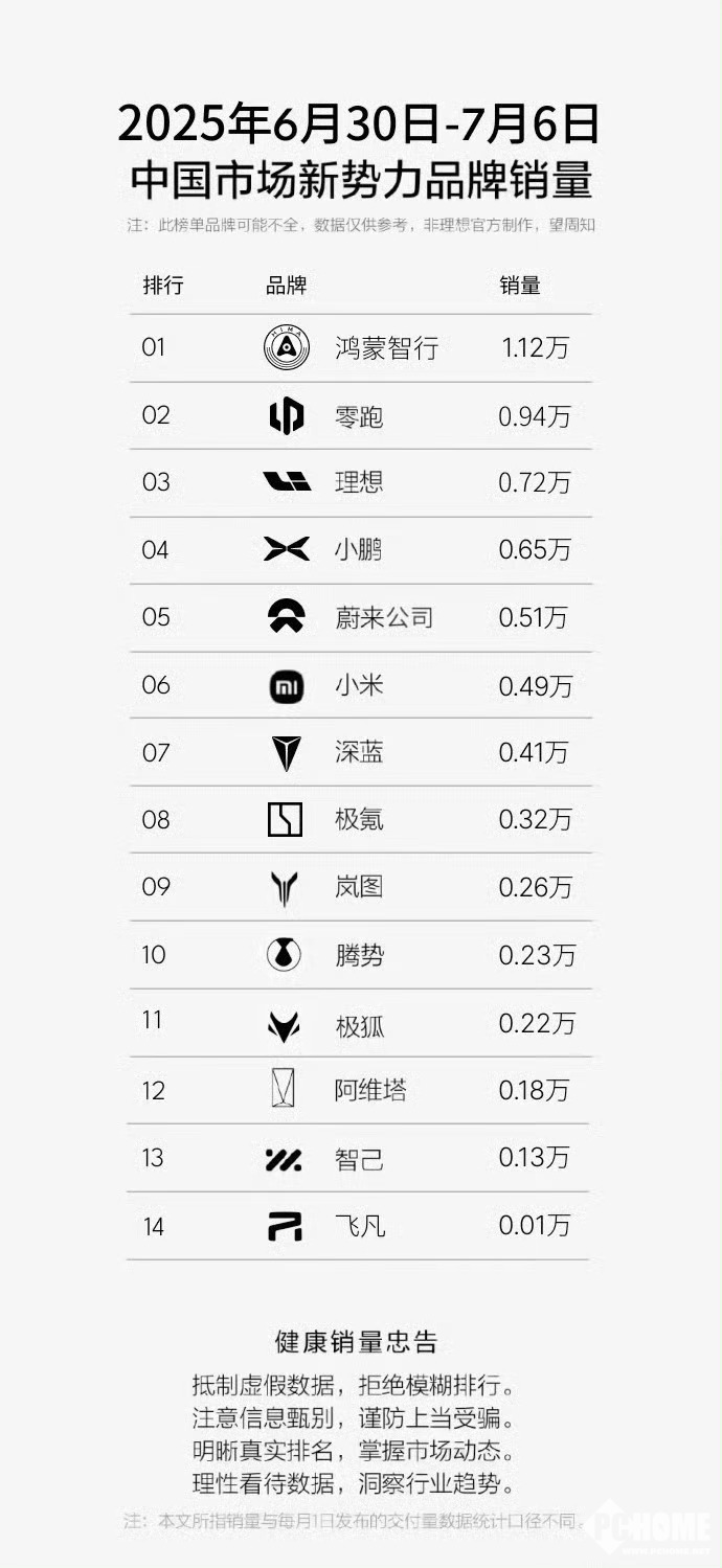 PChome了解到,2025年6月30日-7月6日,中国市场新势力品牌周销数据揭晓,鸿蒙智行周销量为1.12万辆,位列第一。