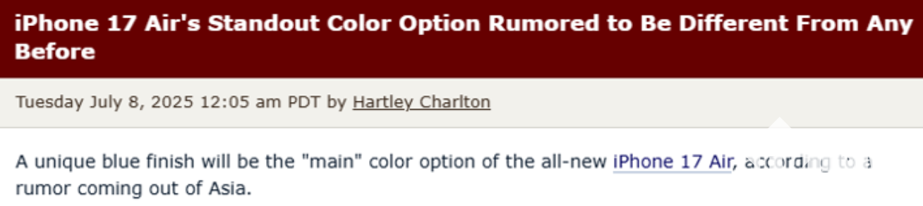 7月8日消息,据海外媒体报道,苹果即将推出的iPhone 17 Air,这款机型将推出一款全新的浅蓝主打配色。