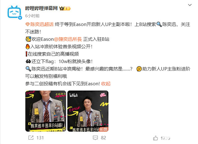 7月8日,B站在今日官宣陈奕迅入驻:欢迎Eason陈奕迅正式入驻B站。陈奕迅随后在B站发布了自己的首条视频。据官方介绍,助力新人UP主涨粉进阶可以触发特别福利,参与二创投稿有机会线下见到Eason本人。