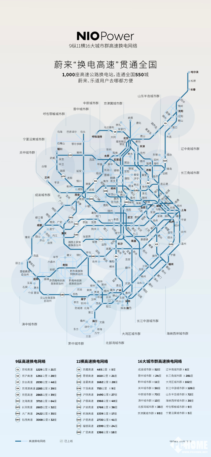 据了解,截至今日,蔚来累计已在全国范围内布局3399座换电站、2883超充站。蔚来高速千站网络覆盖范围极为广泛,连接起全国550个城市,形成了“9纵11横16大城市群”的高速换电主动脉。