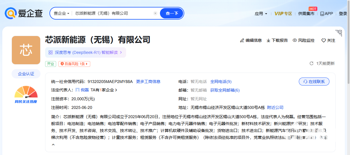 爱企查 App 显示,芯派新能源(无锡)有限公司自6月20日成立至7月2日就发布“简易注销公告”,拟在7月21日前完成注销。这家注册资本2亿元,股东囊括安普瑞斯(无锡)有限公司及多名自然人的企业仅存活了13天。原本瞄准电池制造、新材料研发等热门赛道,却突然“光速下架”。