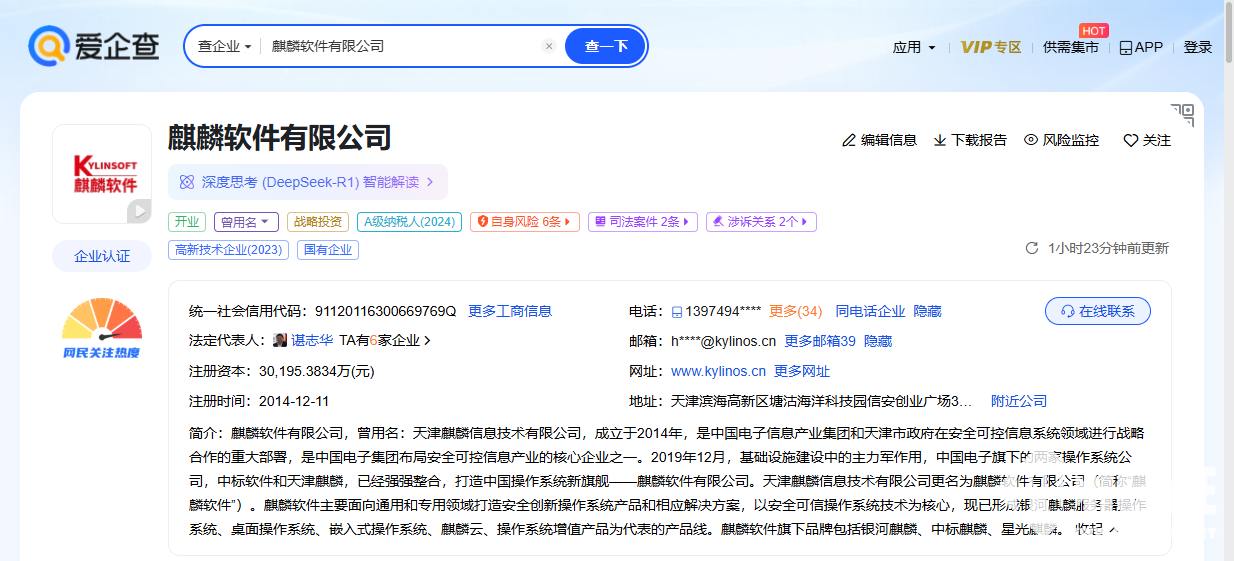 近日,麒麟软件有限公司完成新一轮增资扩股,注册资本增至约3.02亿元,吸引中国移动、中国石化等公司纷纷入股。
