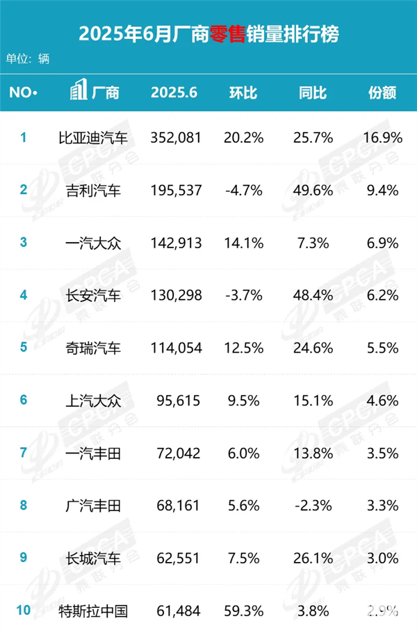 在国产品牌强势发展下,合资品牌市场地位动摇。厂商销量榜前五名中,国产品牌占据四席,仅一汽大众这一合资品牌上榜。比亚迪乘用车6月零售352081辆,同比增长25.7%,国内市占份额达16.9%,远超第二名吉利汽车近15.5万辆,统治力显著 。吉利汽车凭借银河星愿、E5等车型,6月销量同比暴涨49.6%,增速居榜单之首 。六至第十名依次为上汽大众、一汽丰田、广汽丰田、长城汽车、特斯拉等品牌 。整体来看,国产车在6月销量表现中成绩斐然,市场格局正加速重塑 。