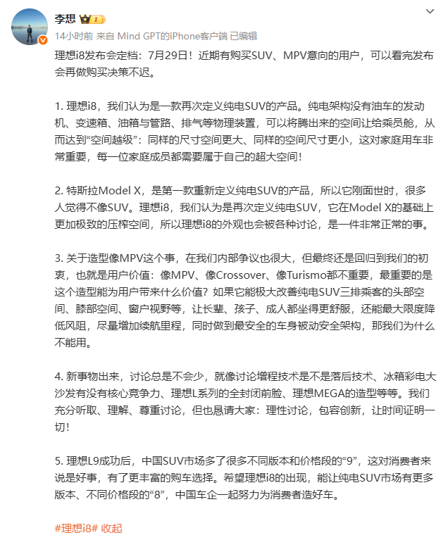 7月10日,昨日晚间,理想官宣理想i8的发布会定档7月29日,同时发布了预热图。理想i8定位为家庭六座纯电SUV。理想汽车CEO李想也发文表示,近期有购买SUV、MPV意向的用户,可以看完发布会再做购买决策不迟。同时认为理想i8是一款再次定义纯电SUV的产品。