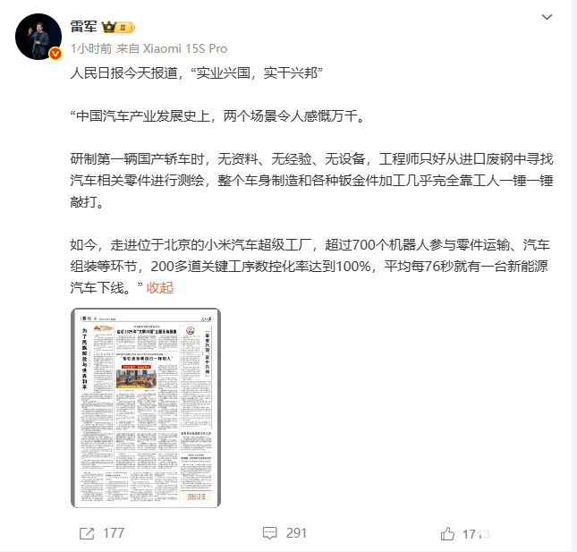 7月10日,今日在《人民日报》近日刊发的文章《实业兴国,实干兴邦》中,特别提及了小米汽车,通过对比往昔与当下,展现出中国汽车产业今昔巨变。随后小米创办人,董事长兼CEO雷军在微博上转发了该文章。