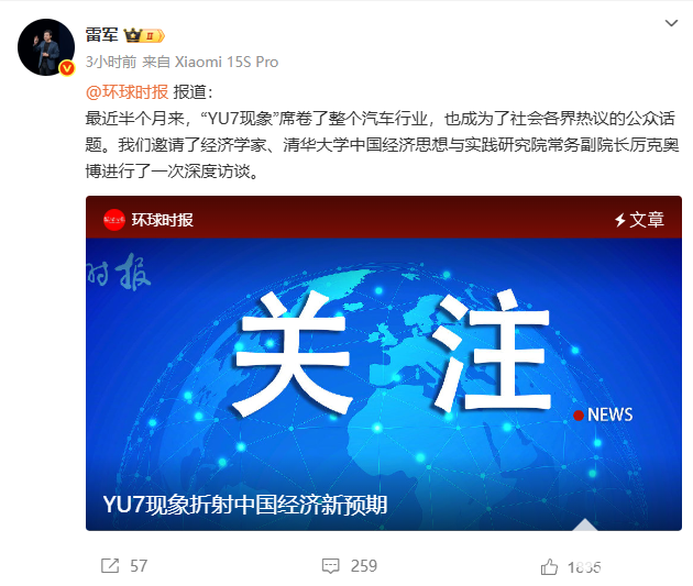 此前,雷军也转发了环球时报的报道:《YU7现象折射中国经济新预期》。根据第三方数据,YU7上市72小时内,小米汽车全国335家门店中,平均每店锁单800至900台,锁单率高达75%-80%。外媒发出感叹:“特斯拉在中国市场正迎来前所未有的竞争对手”。经济学家、清华大学中国经济思想与实践研究院常务副院长厉克奥博也认为,这毫无疑问这是现象级事件。在整个汽车工业史上,从来没有谁能一下子能有这么高的订单量。