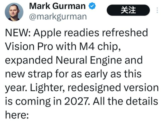 7月10日消息,据彭博社报道,苹果计划最早于今年推出搭载M4芯片、升级版神经网络引擎和全新表带的全新Vision Pro。此外,更轻巧、重新设计的版本将于2027年上市。