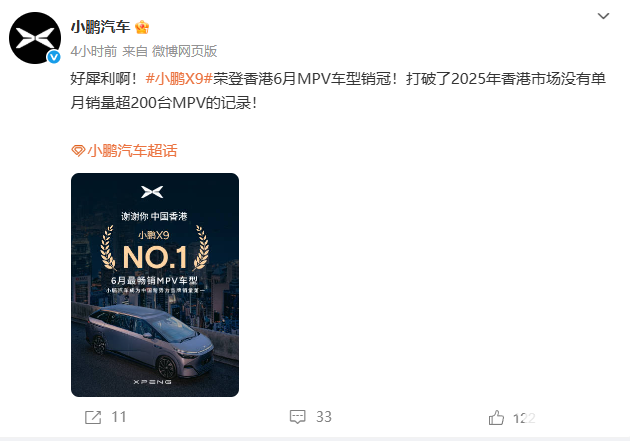 7月10日,小鹏汽车官方宣布,旗下小鹏X9车型在香港6月MPV车型销量排行榜中拔得头筹,成为2025年以来香港MPV市场首款单月销量突破200台的车型。