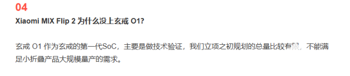7月10日,小米今日发布小米MIX Flip 2答网友问(三),针对网友热议的“小米MIX Flip 2为何未采用玄戒O1芯片”给出回应。小米官方表示,玄戒O1作为玄戒的第一代SoC,主要用于技术验证,立项之初规划的总量有限,难以满足小折叠产品大规模量产的需求 。