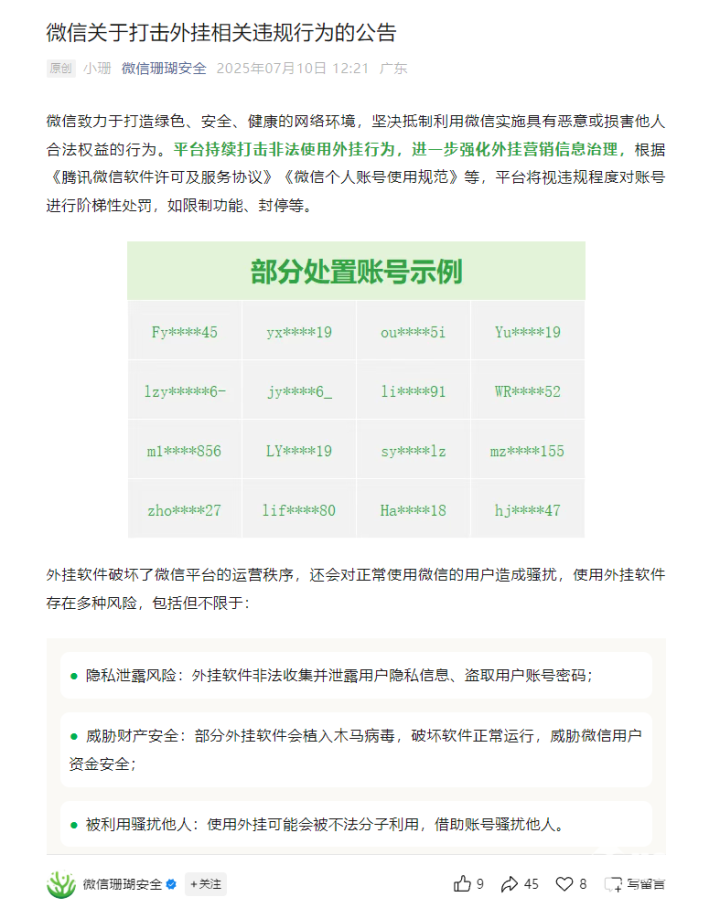 7月10日,微信珊瑚安全公众号今日发布关于打击外挂相关违规行为的公告,进一步强化对外挂及外挂营销信息的治理力度,对涉事账号施以阶梯性处罚,包括限制功能使用、封停账号等。