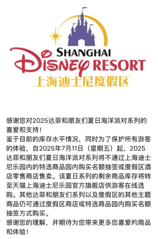因此,上海迪士尼度假区发文称,自2025年7月11日起,“2025达菲和朋友们夏日海洋派对系列”将不通过上海迪士尼乐园内的特选商品园内购买名额抽签或度假区酒店零售商店售卖。该夏日系列的剩余商品库存将转至天猫上海迪士尼乐园官方旗舰店供游客在线选购。其他达菲和朋友们系列以及度假区的其他主题商品仍可通过度假区商店或特选商品园内购买名额抽签方式购买。