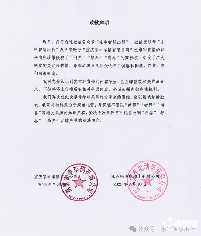 在道歉声明中,宗申表示:“近日我司通过微信公众号“宗申智慧出行”、微信视频号“宗申智慧出行”及抖音账号“重庆宗申车辆有限公司”发布和直播的部分内容涉嫌侵犯了“问界”“智界”“尚界”的商标权,引发了广大网友的关注和传播,并给品牌方及公众造成了误解和困扰。在此,我们深表歉意。”同时他们也表示已立即整改相关产品命名,下架并停止传播所有相关争议内容,全面加强内部审核机制。