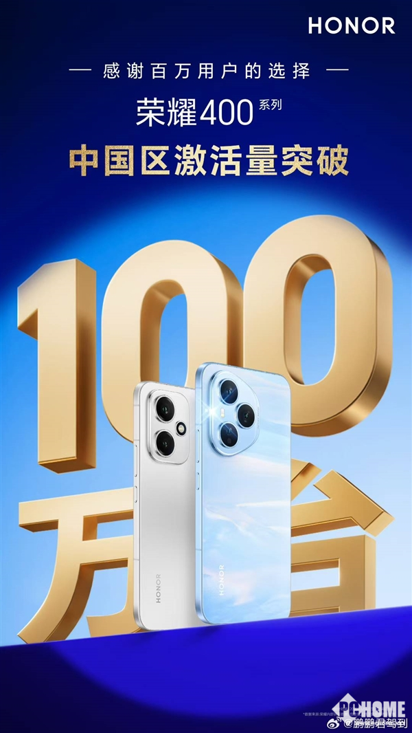 荣耀400系列中国区激活量已突破100万台,成为荣耀近三年来最快破百万的机型。