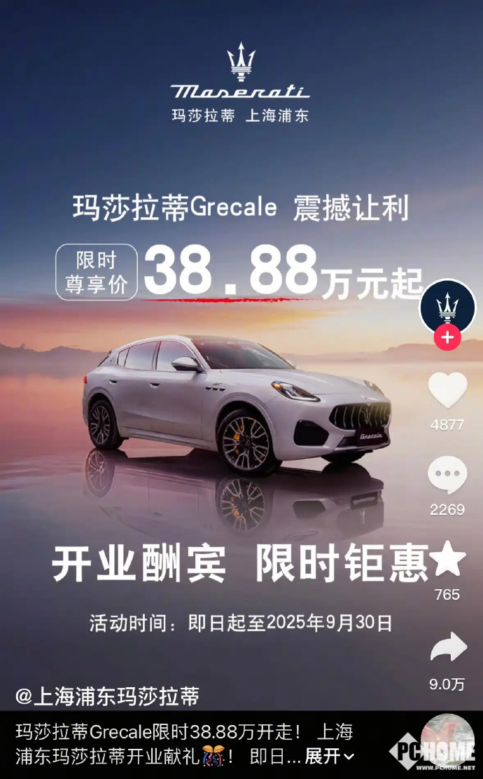 近日,名为“上海浦东玛莎拉蒂”的账号发布海报称,玛莎拉蒂的SUV车型Grecale限时尊享价38.88万元起,活动时间截止到9月30日。官方信息显示,玛莎拉蒂Grecale的指导价为65.08-103.88万元,相比之下,“上海浦东玛莎拉蒂”的起售价低了26.2万元。
