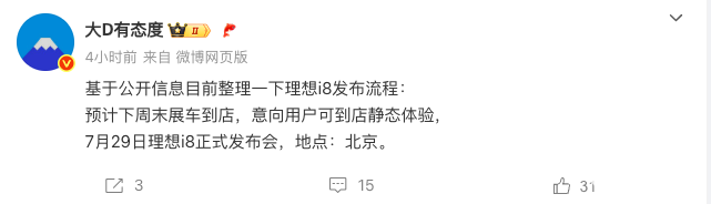 7月10日,被誉为理想汽车“野生CEO”的“大D有态度”在社交媒体平台分享了理想i8的发布流程:预计下周末展车到店,意向用户可到店静态体验,7月29日理想i8正式发布会,地点:北京。针对网友关心的“静态体验能看内饰吗?”,“大D有态度”回应称:“我觉得必须可以。”