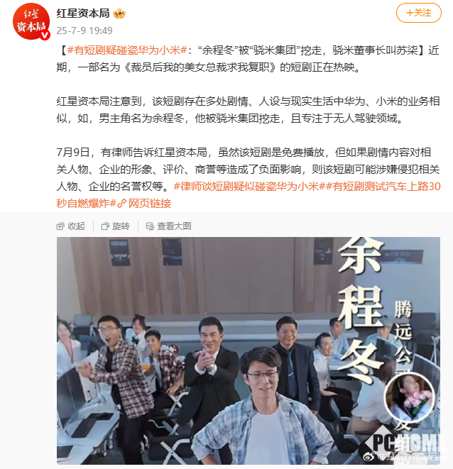 7月11日,近日PChome发现,一部名为《裁员后我的美女总裁求我复职》的短剧中男女主姓名、所在公司以及剧情等都与现实中华为、小米高度相似。比如:男主“余程冬”负责研发无人驾驶系统,后被“骁米”集团董事长“苏柒”挖走。