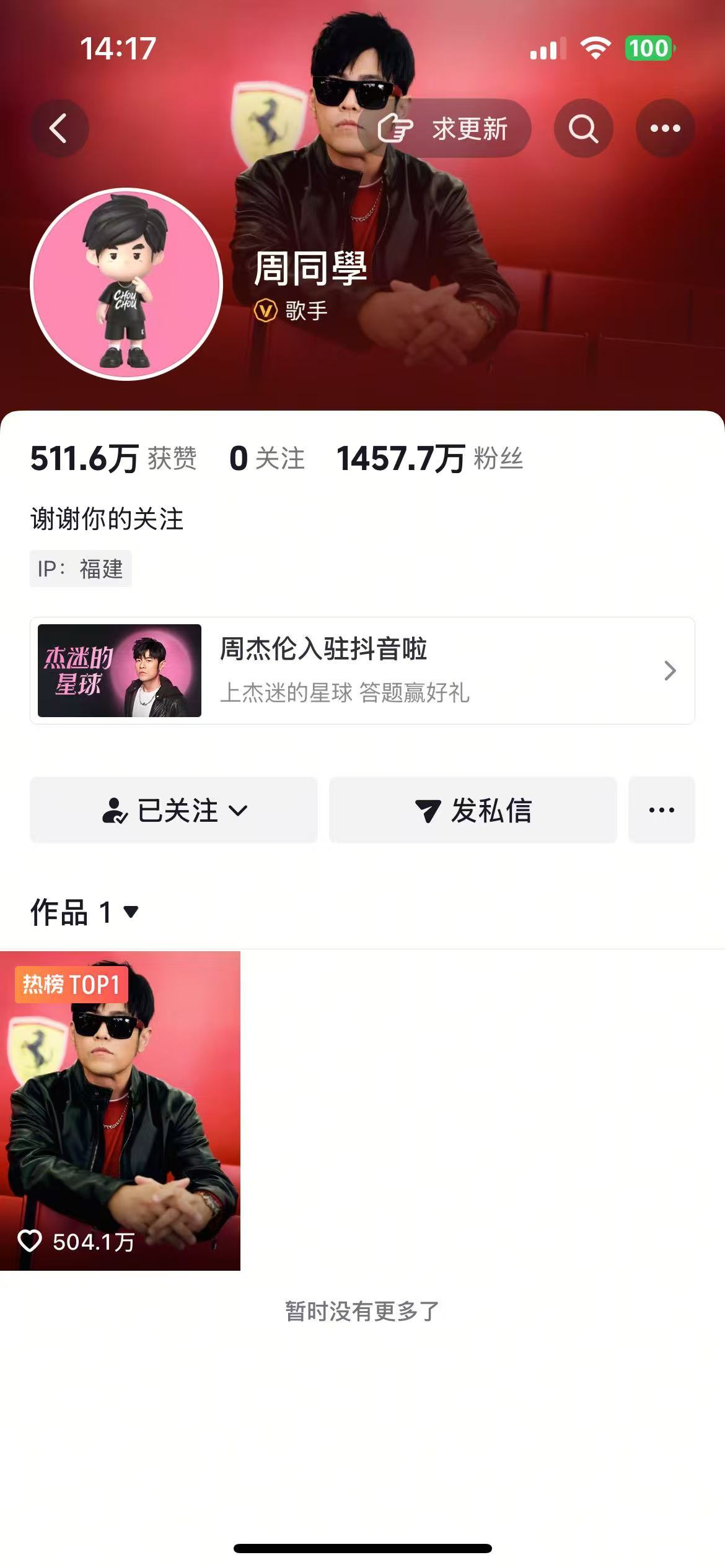 据此前报道,7月9日,华语流行乐歌手周杰伦正式开通抖音账号,取名“周同学”,并选择用玩偶形象作为账号头像。在账号开通后的24小时内,周杰伦未发布任何视频作品,但粉丝量已突破1000万。目前粉丝量已突破1450万。