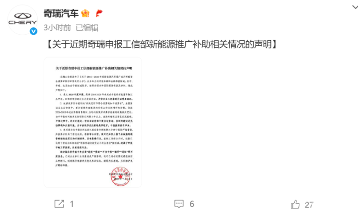 7月12日,奇瑞汽车官方发布了关于近期“奇瑞申报工信部新能源推广补助相关情况的声明”。明确否认存在违规骗补行为,并详细说明补贴申报流程及核减原因。