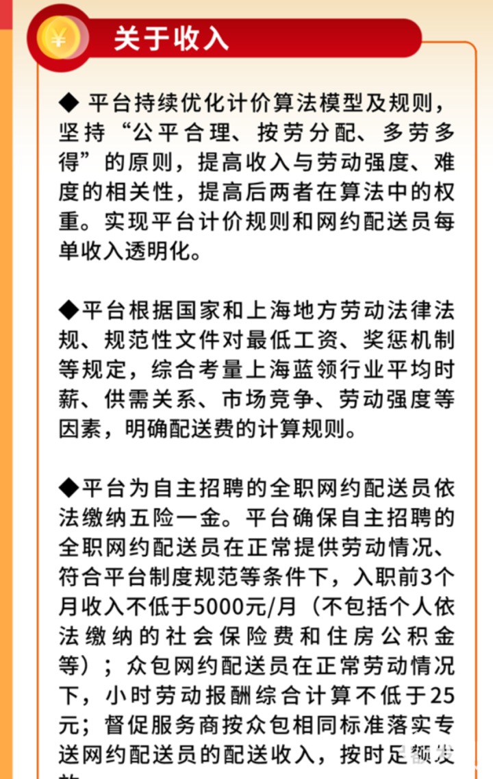7月12日,京东秒送与上海地区骑手代表达成最新协议,确保其在正常提供劳动情况、符合平台制度规范等条件下,入职前3个月收入不低于5000元/月(不包括个人依法缴纳的社会保险费和住房公积金等)。