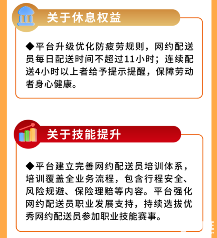 除此之外,根据协议网约配送员每日配送时间不超过11小时,连续配送4小时以上者给予提示提醒。在配送时长计算中优化安全限速规则,最高瞬间时速不超过25km/h。提供5万顶智能头盔,保护网约配送员安全配送。持续建设“清凉驿站”、开展“暖冬行动”,极端天气下暂停配送业务。