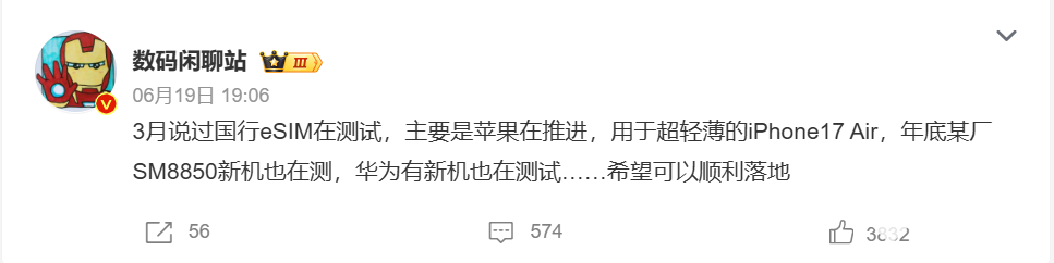 今年6月,数码博主“数码闲聊站”表示,国行eSIM测试主要是苹果在推进,用于iPhone 17 Air,年底某厂骁龙8 Elite 2新机和华为新机也正在测试。因设计过于超薄,iPhone 17 Air无法容纳物理SIM卡槽,仅支持eSIM,这意味着iPhone 17 Air国行版必须依赖eSIM技术。