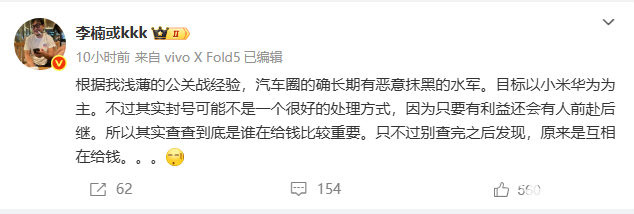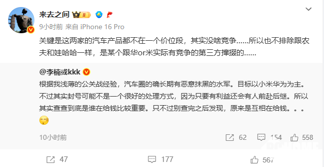 李楠还表示:“不过其实封号可能不是一个很好的处理方式,因为只要有利益还会有人前赴后继。所以其实查查到底是谁在给钱比较重要。只不过别查完之后发现,原来是互相在给钱。”“来去之间”转发并回应称:“关键是这两家的汽车产品都不在一个价位段,其实没啥竞争……所以也不排除跟农夫和娃哈哈一样,是某个跟华or米实际有竞争的第三方撺掇的……”