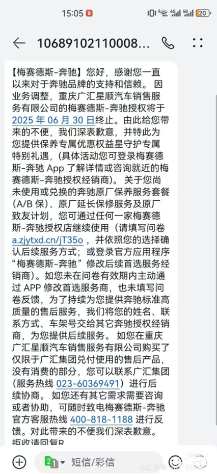除此之外,许多网友也纷纷晒出自己收到了重庆兴顺奔驰4S店发来的短信,其上显示:“因业务调整,重庆星顺汽车有限公司的梅赛德斯-奔驰授权将于2025年07月11日终止。关于您尚未使用或兑换的奔驰原厂A/B保养服务套餐(A保为小保养,B保为大保养)、原厂延长保修服务及原厂致友计划,您可通过任何一家梅赛德斯-奔驰授权店继续使用(需自行选择经销商)。”