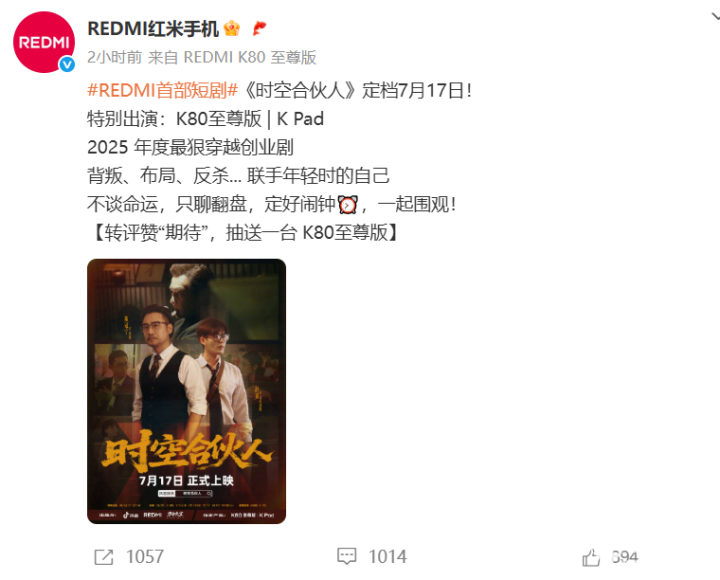 7月14日消息,今日,小米REDMI首部短剧《时空合伙人》定档7月17日,号称是“2025年度最狠穿越创业剧”。