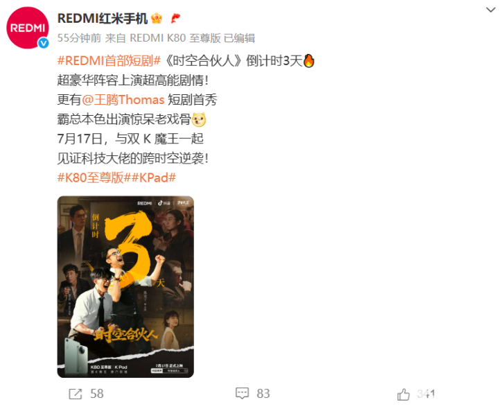 据悉,这部短剧由抖音、REDMI、万合天宜出品,指定产品有REDMI K80至尊版手机以及K Pad平板。王腾本人还发文表示:短剧剧情比较抓马,大家到时候看着开心一下就好。而小米集团公关部总经理王化也透露自己已经一口气看完了整部剧,认为该短剧是“今夏最值得看的短剧”。