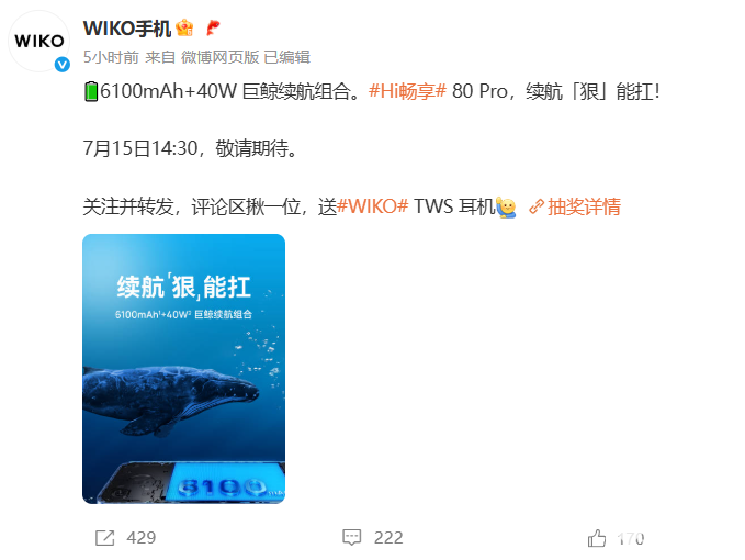 7月14日消息,WIKO官方微博发文称,Hi畅享80 Pro将采用6100mAh+40W巨鲸续航组合,支持超级快充Turbo,将于7月15日14:30发布。