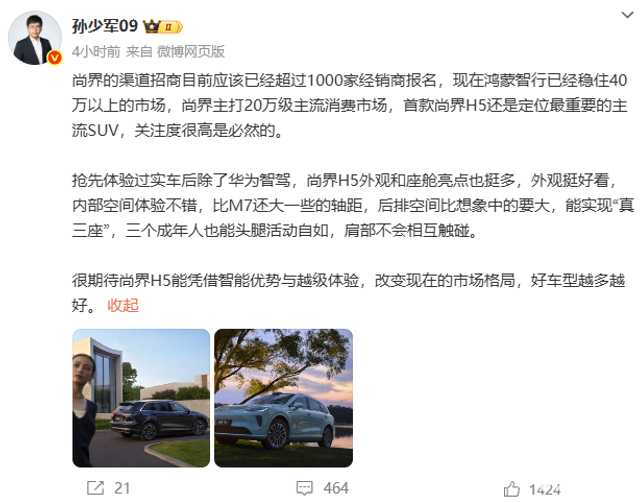 2025年7月14日,知名汽车博主“孙少军09”爆料称,尚界主打20万级主流消费市场,首款尚界H5还是定位最重要的主流SUV,目前尚界的渠道招商应该已经超过1000家经销商报名。