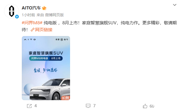 7月15日,AITO汽车官方今日发文宣布,问界M8纯电版将于8月正式上市。