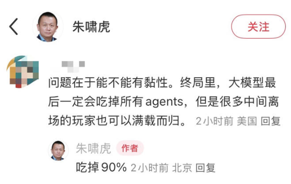 也有网友并不认可朱啸虎的观点。“我觉得还是有区别,最大的不同在于AI Agent更多工具属性,而互联网早期的草根创业基本是娱乐属性(即使是工具属性的草根创业也是服务于有娱乐属性的目的)。从这种角度AI Agent的粘性还有使用频率都会比较难获得。”