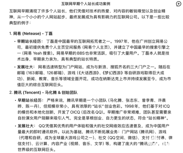 朱啸虎表示,今天的AI agent创业非常像互联网早期的个人站长,DeepSeek总结的当年从个人站长起步,最终成长为有影响的互联网公司的案例今天的AI Agent创业者值得参考。