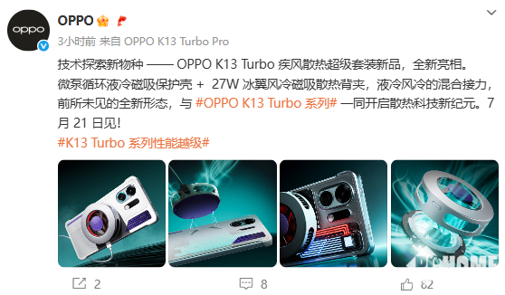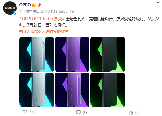 7月15日消息,OPPO官方微博正式公布了OPPO K13 Turbo系列新机外观,展示了新机的风扇等外观细节,以及全新配色,将于7月21日正式发布。