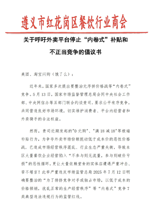 7月15日,近日外卖大战的大量补贴引发了广泛关注。在今日上午11时许,贵州省遵义市红花岗区餐饮行业商会发布《呼吁外卖平台停止“内卷式”补贴和不正当竞争倡议书》。