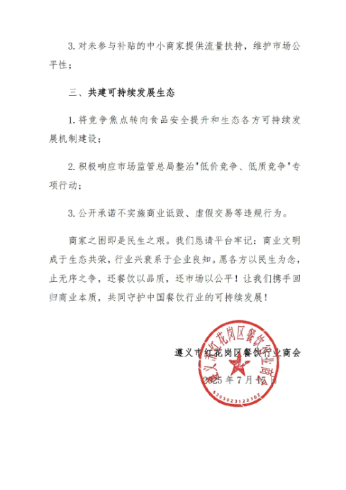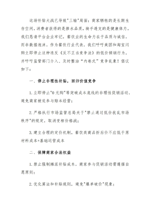 根据该倡议书的内容,他们向美团和淘宝闪购(饿了么)两家平台提出“停止非理性补贴,回归价值竞争”“保障商家合法权益”“共建可持续发展生态”三点倡议。同时表示,两家公司平台发起的“0元购”“满18减18”等极端补贴行为已造成商家、消费者和骑手的“三输”局面,导致本区大量餐饮企业经营陷入“不参与则无流量,参与则破价亏损”的恶性循环,更让大量依赖堂食的实体店遭遇严重冲击、苦不堪言!