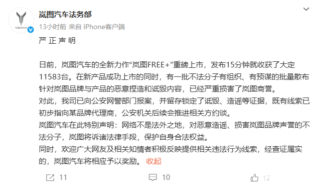 7月16日,岚图法务部今日发布严正声明称,在岚图FREE+成功上市的同时,有一批不法分子有组织、有预谋的批量散布针对岚图品牌与产品的恶意捏造和诋毁内容,已经严重损害了岚图商誉。