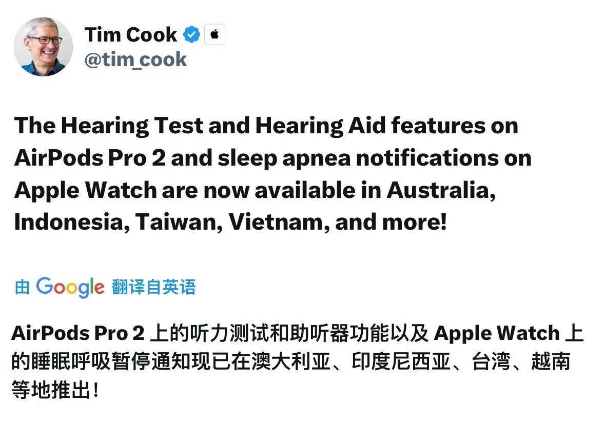 7月16日,苹果CEO蒂姆·库克在X平台发文,宣布AirPods Pro 2耳机听力测试、助听器功能及Apple Watch手表“睡眠呼吸暂停检测”功能将新增多个市场支持。
