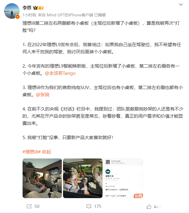 7月16日,理想汽车CEO李想在社交平台发文回应“被打脸”。此前李想曾说过不喜欢在驾驶位后面增加小桌板。但今年发布的理想L9智能焕新版以及即将发布的理想i8在主驾位后新增了小桌板,第二排左右侧各有一个小桌板。