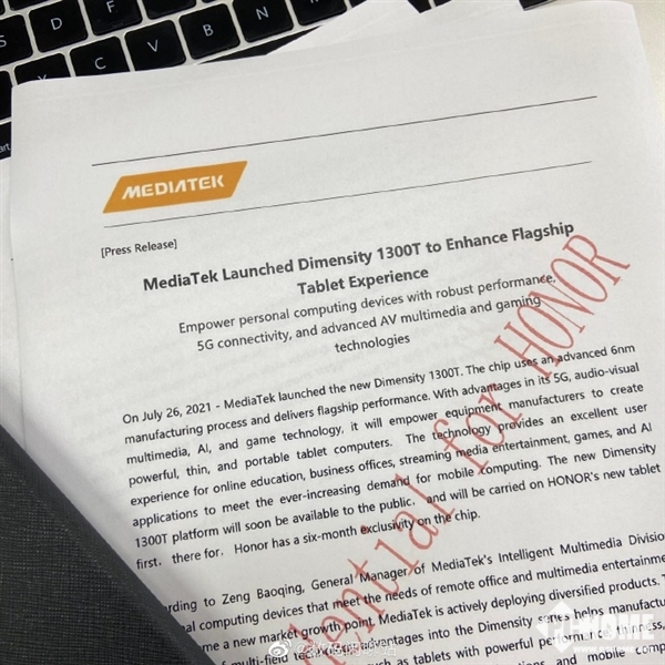 7月23日,荣耀公布了荣耀平板V7 Pro的首支预热视频。根据爆料显示,荣耀平板V7 Pro将会全球首发联发科最新顶级旗舰芯片天机1300T,虽然目前暂未有关于这款芯片的详细参数流出,但是消息称可以确定其将采用台积电6nm工艺打造。