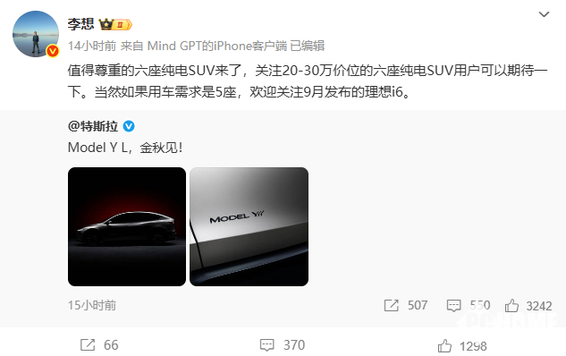 7月17日,特斯拉在昨晚官宣新车Model Y L,并表示“金秋见”。随后理想汽车CEO李想转发并表示,这是值得尊重的六座纯电SUV,同时如果用车需求是5座,欢迎关注9月发布的理想i6。